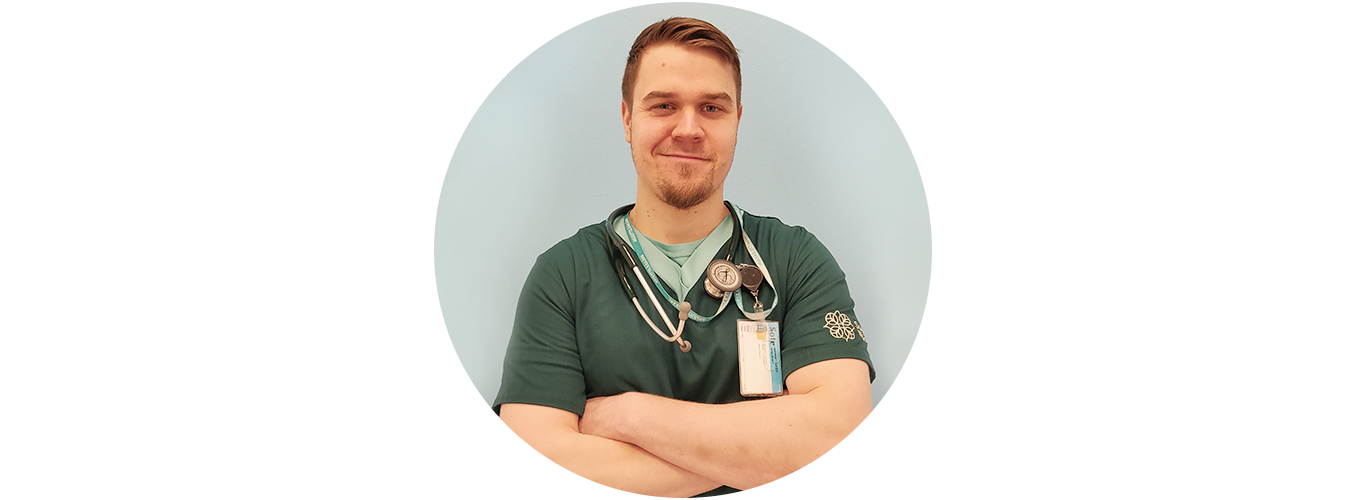 Moi! Olen Miika Värri, akuuttilääketieteeseen erikoistuva lääkäri. Suoritan tällä hetkellä viimeisiä reunapalveluita ja valmistuminen akuuttilääketieteen erikoislääkäriksi on toivottavasti vuoden kuluttua. Työskentelen Sairaala Novassa eli Keski-Suomen keskussairaalassa Jyväskylässä. Kotiklinikkani on päivystys, jossa teen töitä erilaisissa työpisteissä, akuuttihuoneen vastuulääkäristä aina YLE päivystykseen. Työ painottuu kuitenkin 90 % erikoissairaanhoidon puolelle.